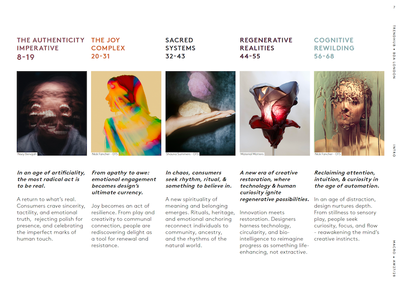 Chaque thème s'ouvre sur une idée forte – un état d'esprit déterminant qui façonne notre art de vivre, de consommer et de créer. Il explore les implications pour les consommateurs, les marques et les espaces, en soulignant les principaux changements étayés par des données et des facteurs culturels.